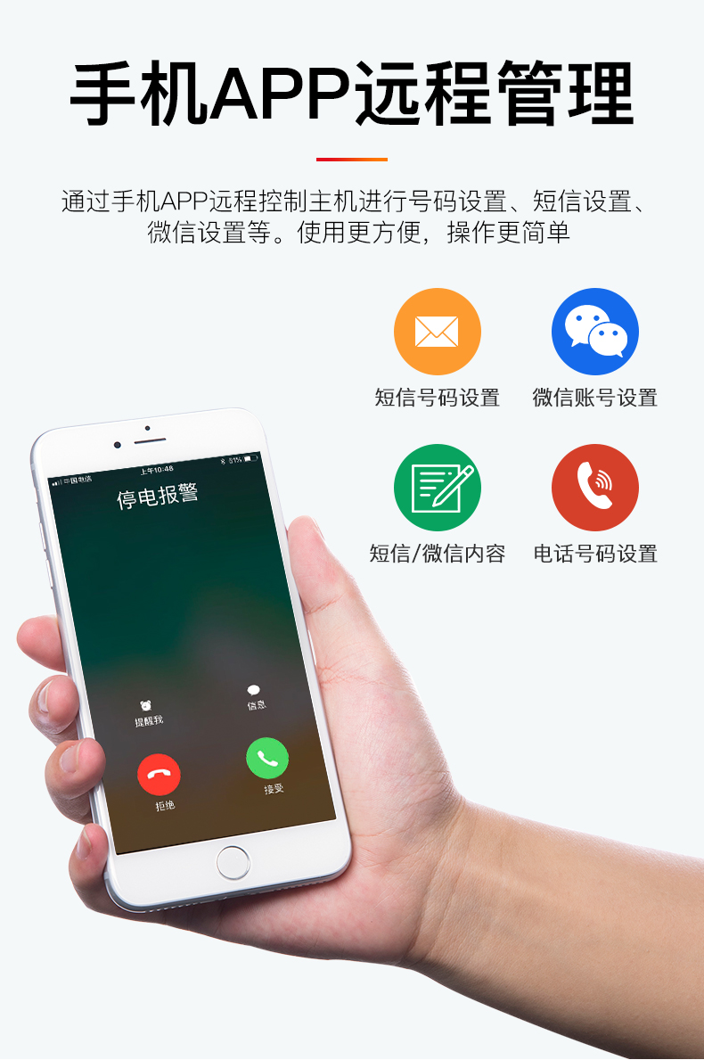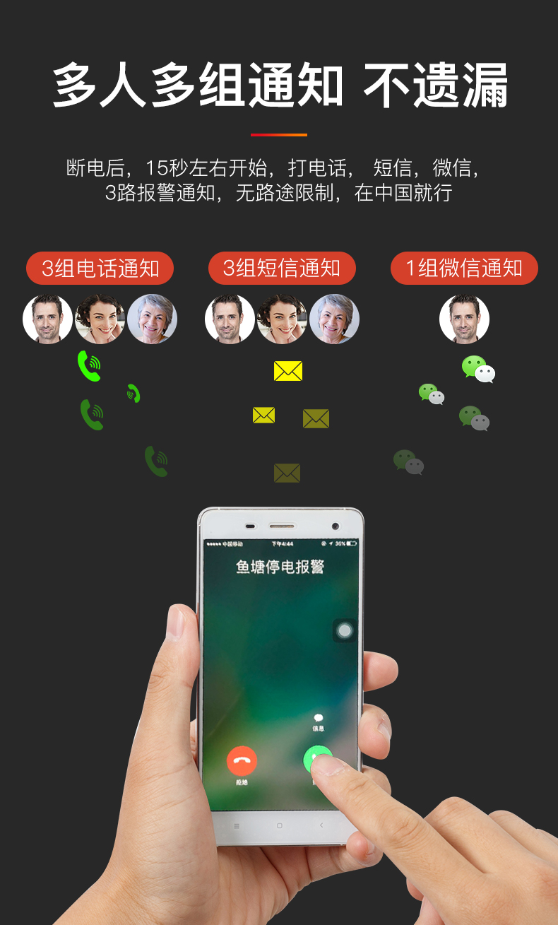 智能停电报警器,可为220V/380V养殖场断电报警器二相电、三相电具可完美支持,可通过手机来电打电话、短信、微信为您第一时间提醒报警信息。