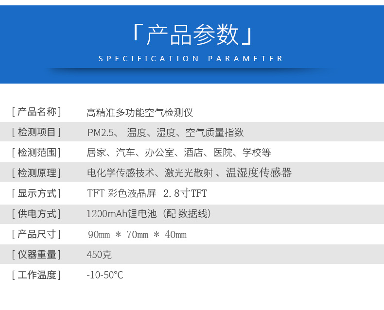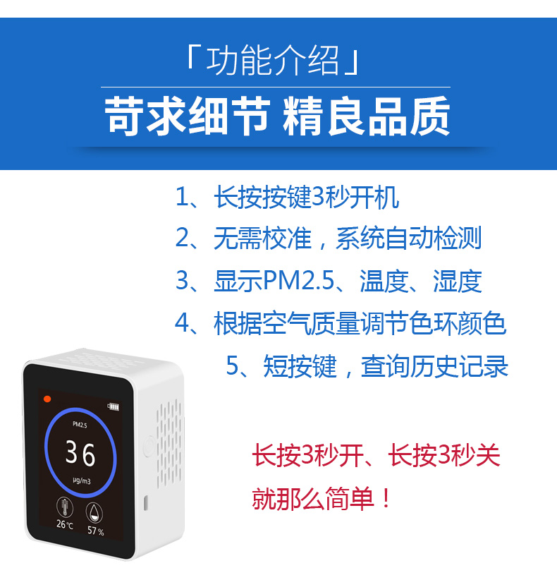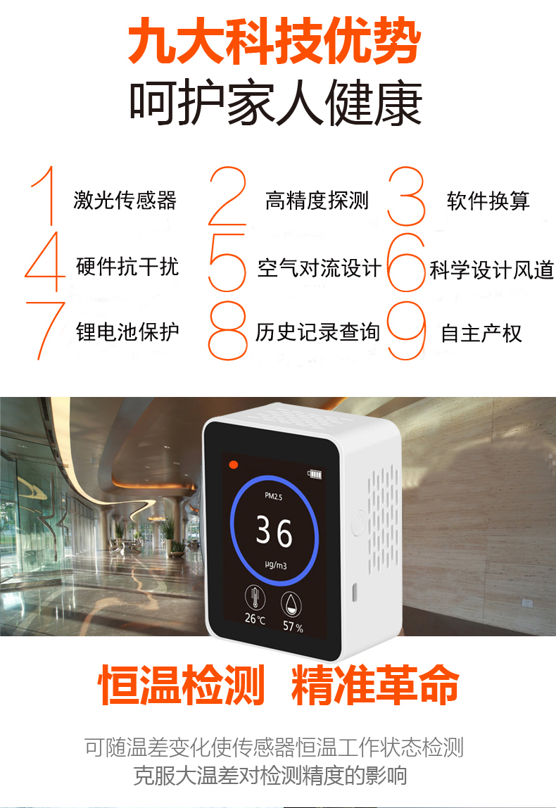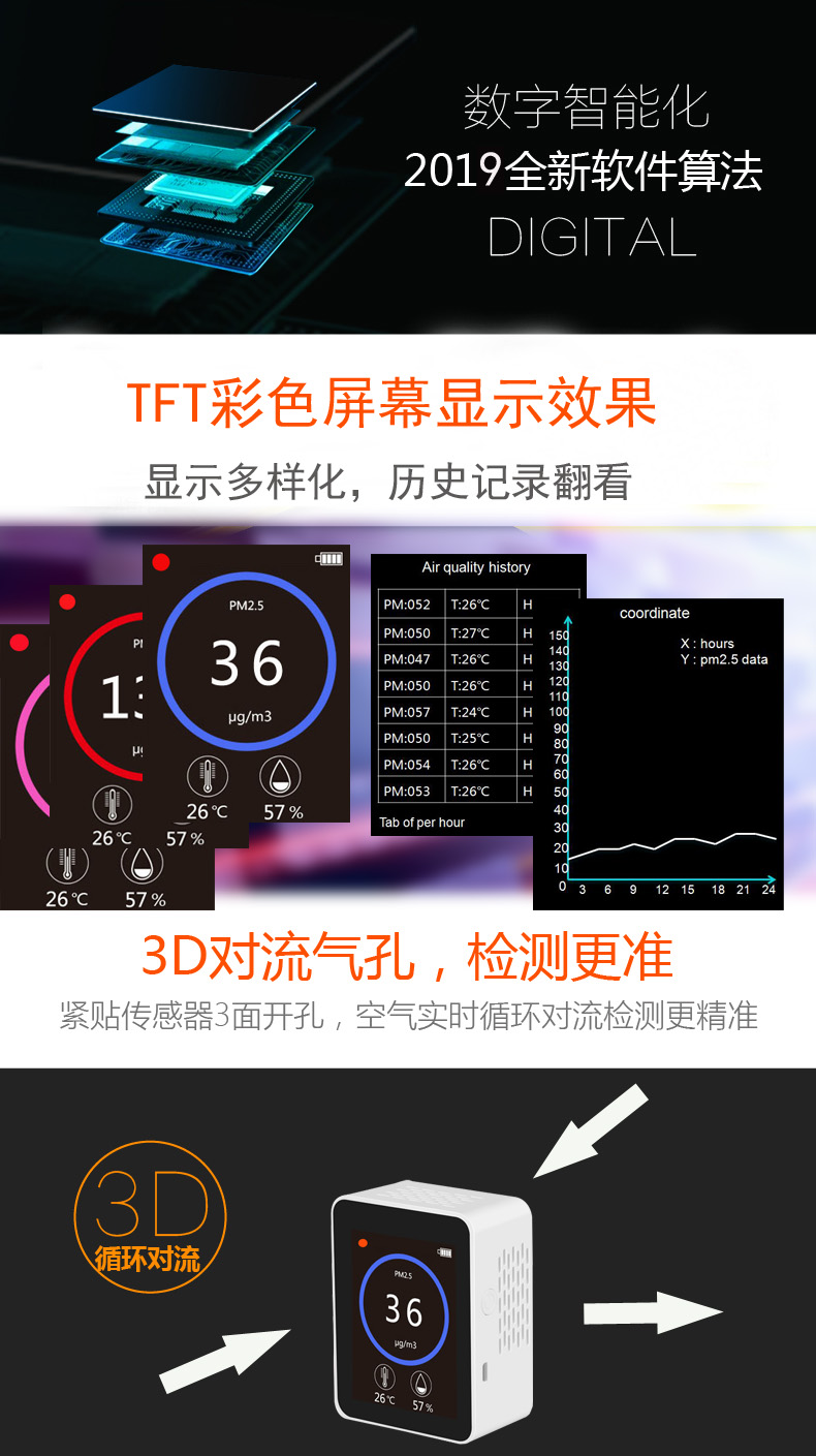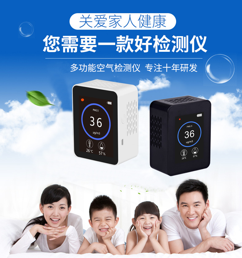 智能Mini型气体检测仪,适用于家庭或商业场所的气体质量检测,可快速便捷的检测甲醛、PM2.5、温度、湿度、氧气、一氧化碳等。可支持客户提供外壳磨具,我们为您定制私有化主板PCB、定制气体检测传感器模块。